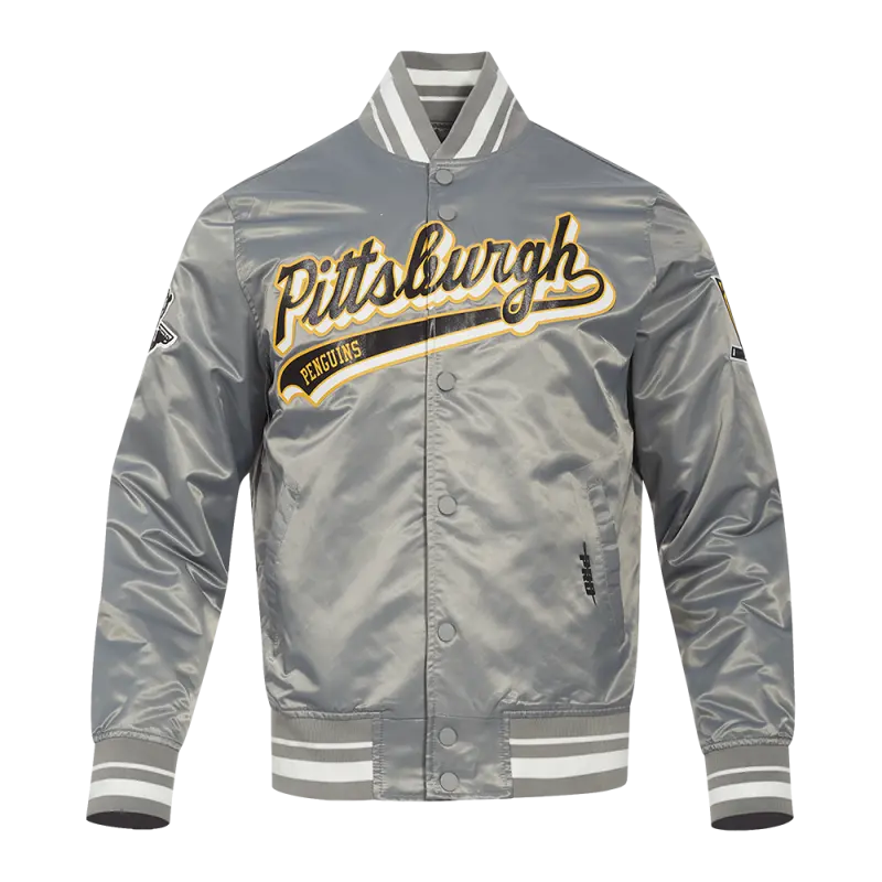 NHL PITTSBURGH PENGUINS SCRIPT TAIL MEN’S SATIN JACKET (GRAY)